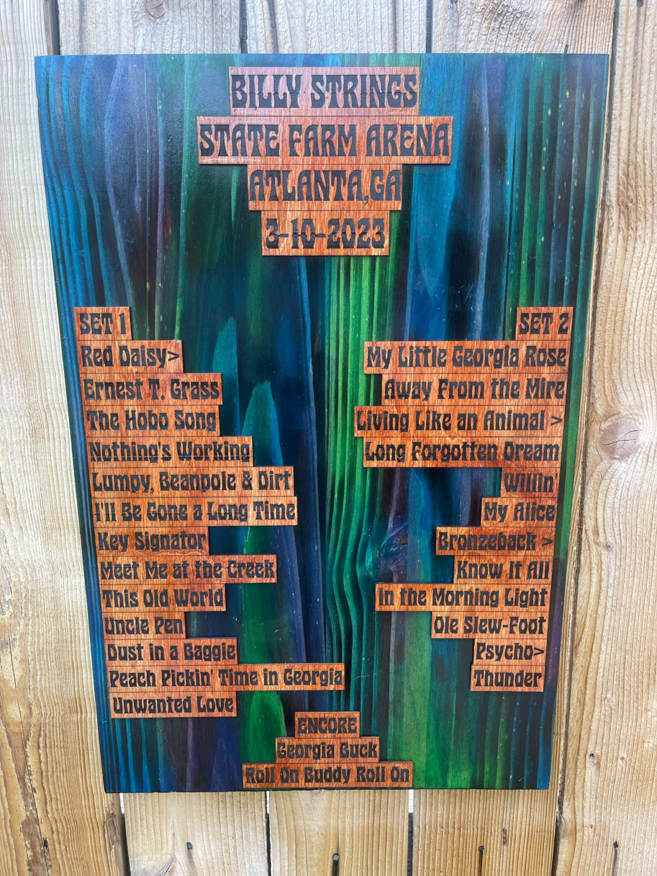 Close up of the top of Billy Strings State Farm Arena setlist art - commemorating the 3.10.2023 Atlanta show.